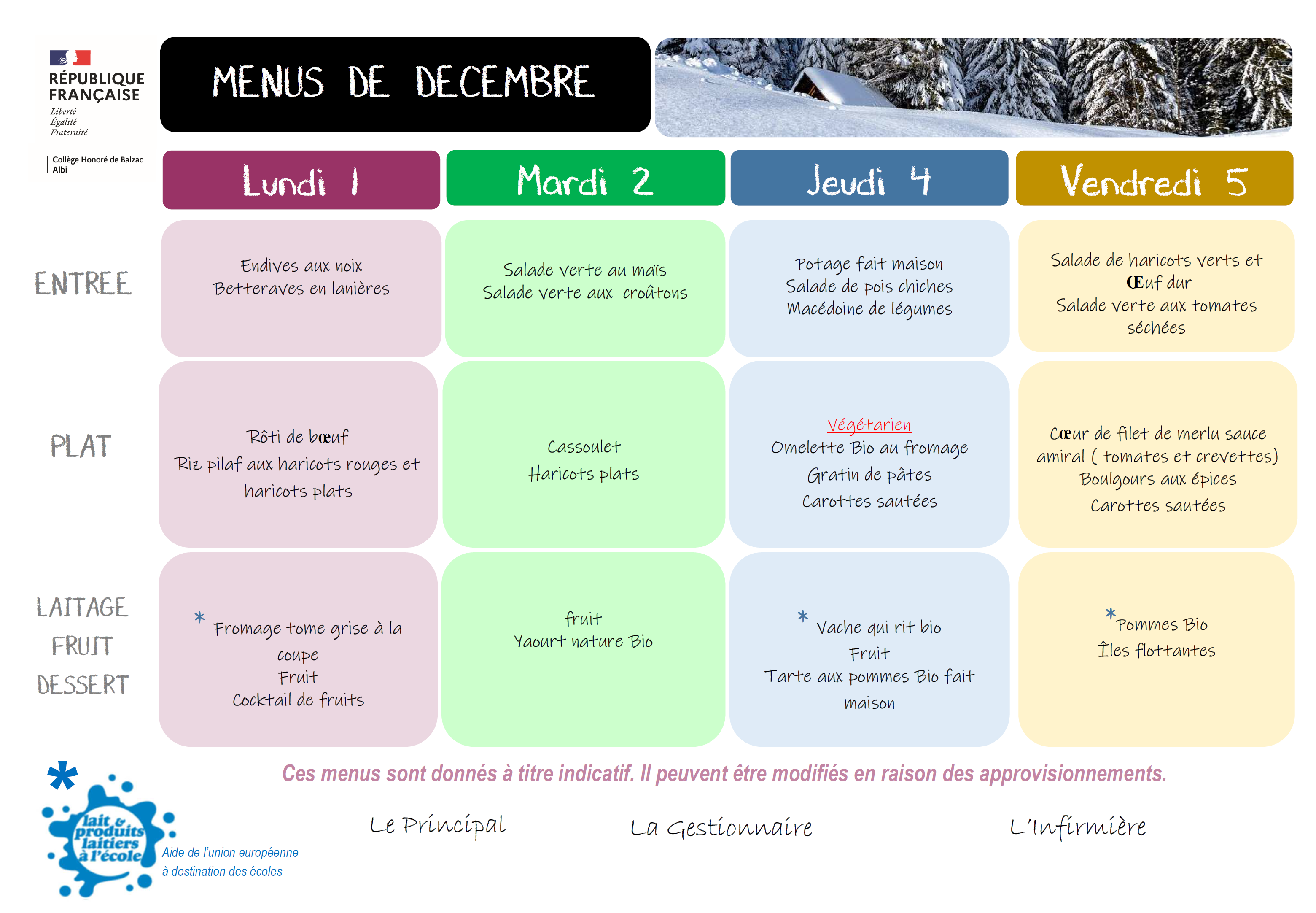 MENU : Semaine du Lundi 1 Décembre Au Vendredi 5 Décembre