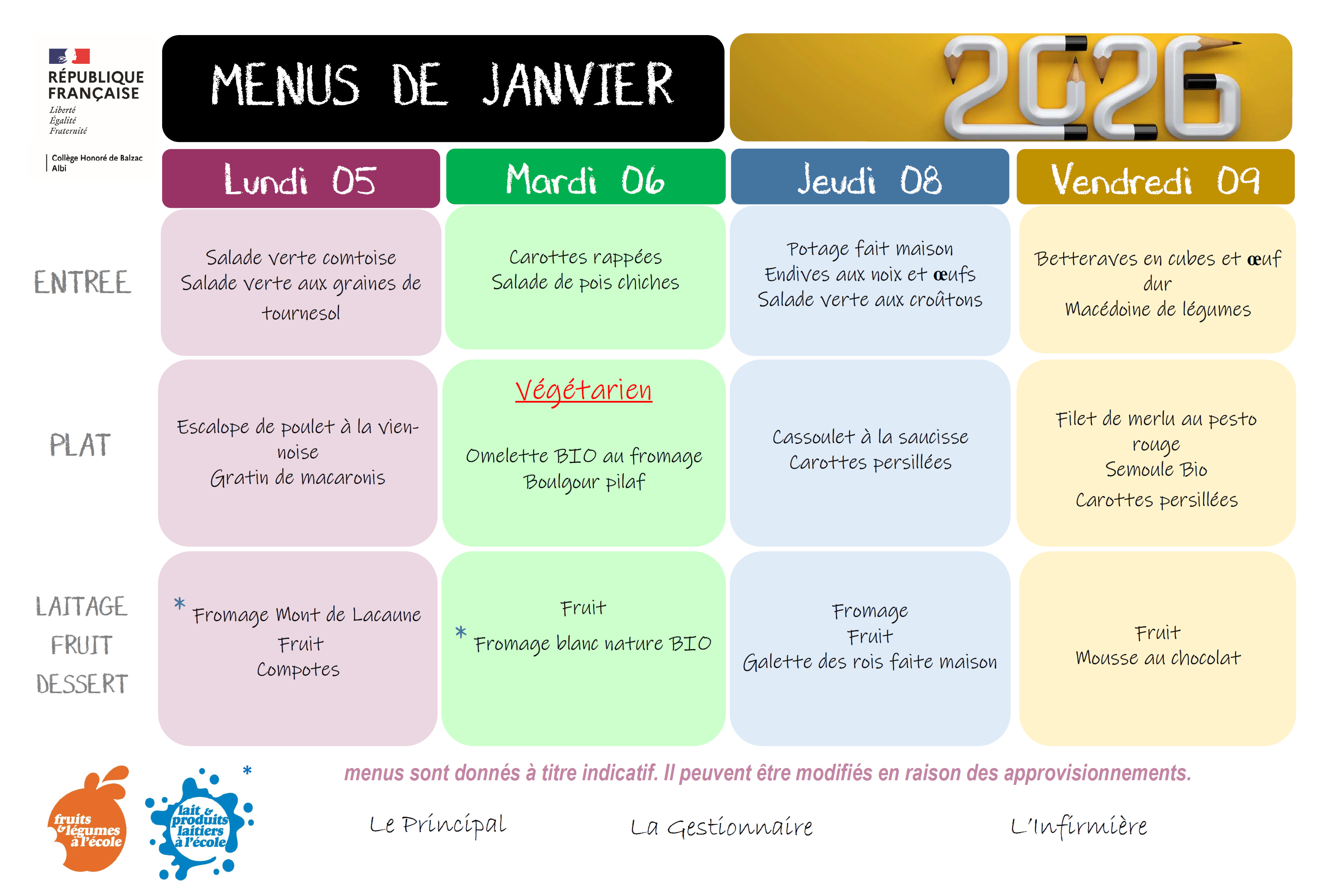 MENU : Semaine du Lundi 5 Janvier Au Vendredi 9 Janvier