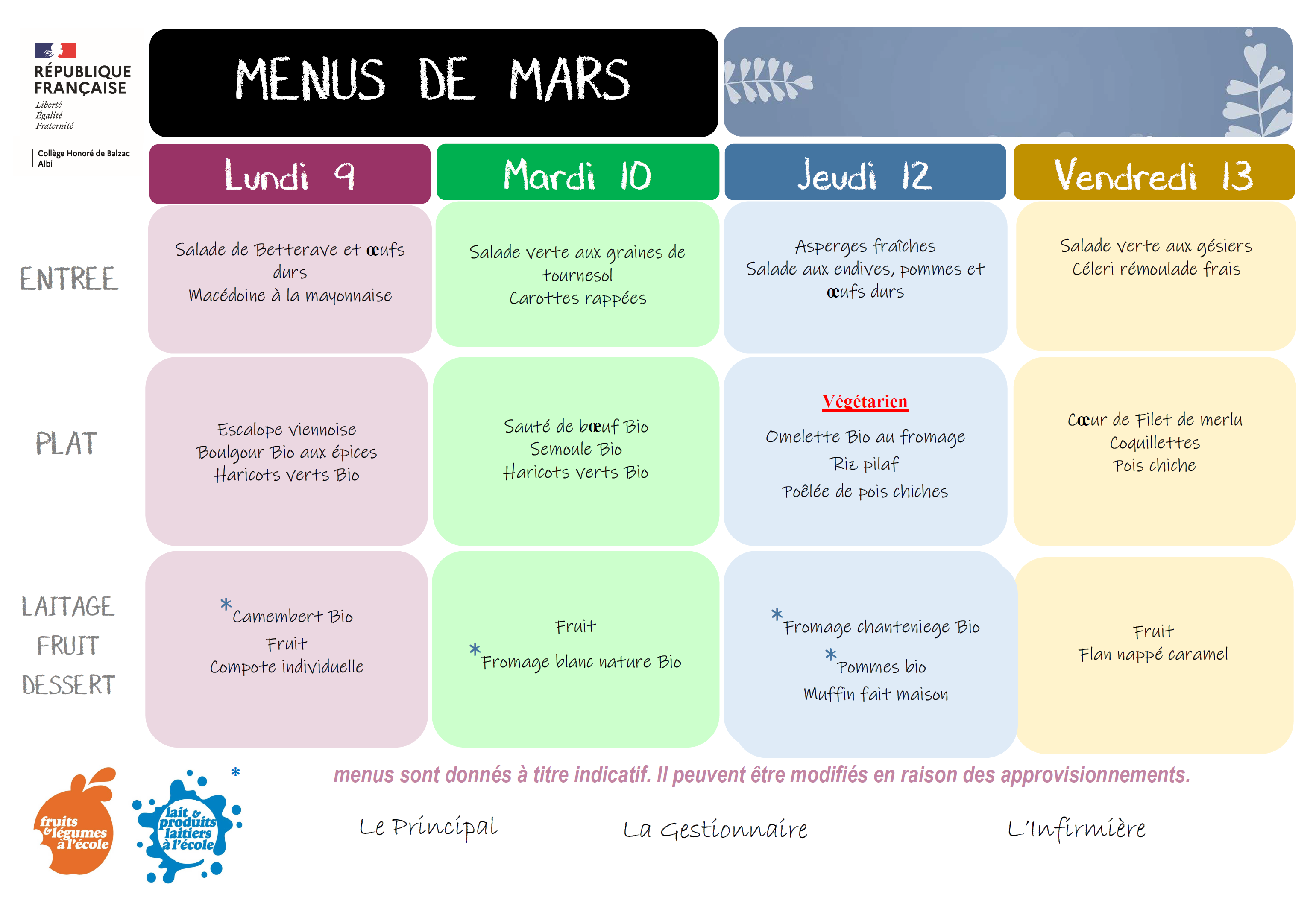MENU : Semaine du Lundi 9 Mars Au Vendredi 13 Mars